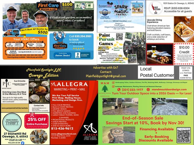 Plainfield Spotlight provides direct mail advertising for local businesses in Plainfield, Oswego, Yorkville, South Naperville, and Aurora, Illinois. Our oversized postcards are mailed to 5,000 targeted households per city, offering an affordable and reliable way to reach nearby customers without depending on online ads or algorithms.